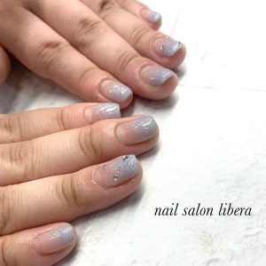 こちらは当店の定額シンプルデザインのメニューてす!ブルーラメのグラデーションにストーンを乗せて夏らしく、爽やかなデザインです!